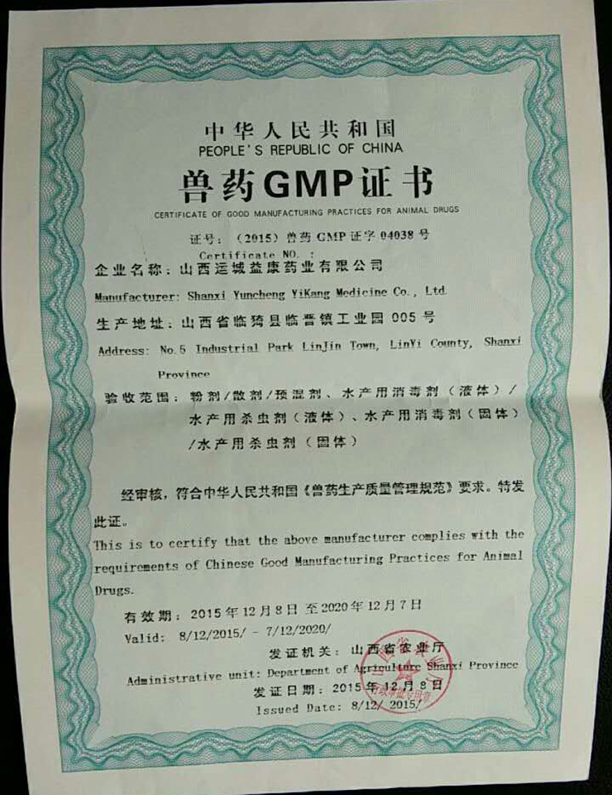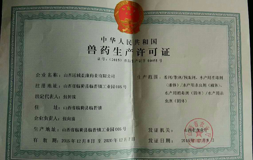 山西运城益康药业有限公司是一家致力于高品质水产药业研发、生产、销售为一体的大型高科技民营企业。公司于2005年10月顺利通过农业部兽药GMP认证。2010年11月顺利通过农业部复检验收,得到专家们的一致好评。